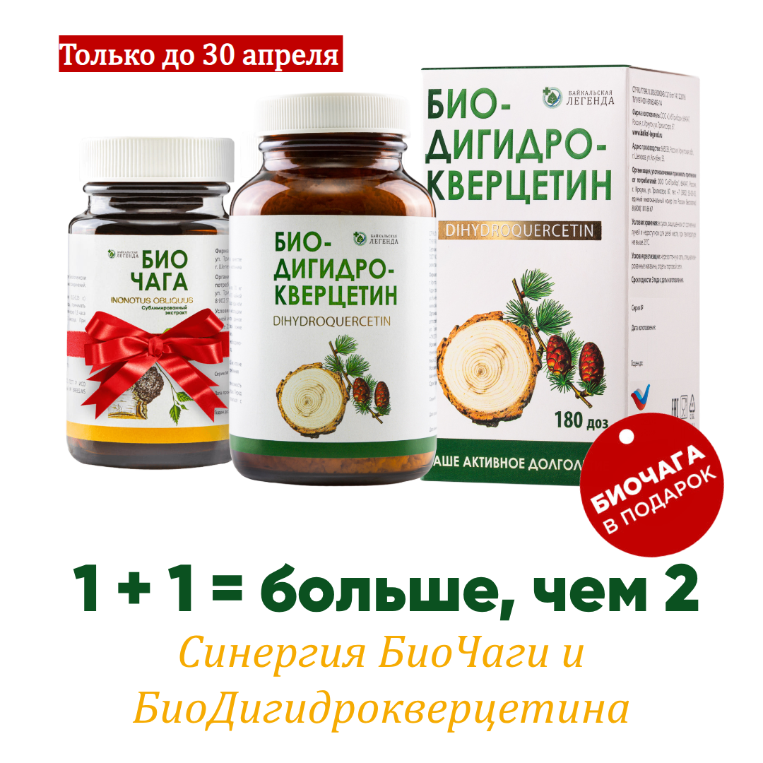 Дарим БиоЧагу при покупке БиоДигидрокверцетина! В апреле мы подготовили специальное предложение для тех, кто хочет получить максимальный эффект от антиоксидантов.